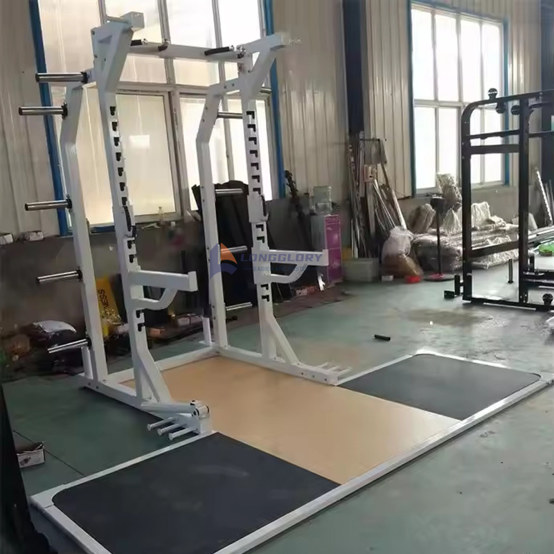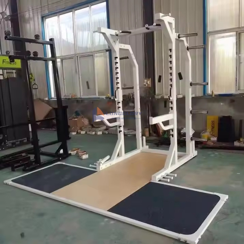 Squat-stativet med vægtløftningsplatform beskytter træningsgulvet mod skader og reducerer støj under træning.