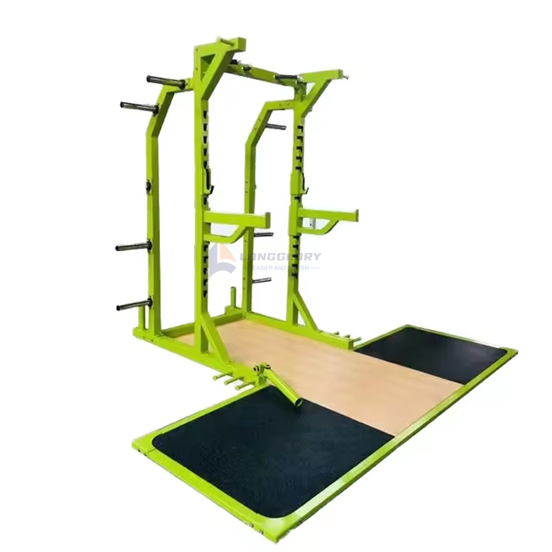 Squat-stativet med vægtløftningsplatform har dimensioner på 2800*3100*2400 mm og er højdejusterbart, denne størrelse giver mulighed for sikker placering af vægtstangen og giver stabil støtte til brugeren for at sikre sikkerhed under træning, og den justerbare højde giver mulighed for en bred række forskellige motionister at træne.